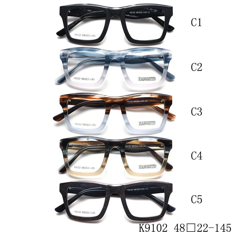 Model No. K9102: These glasses are square in shape and can be worn on all face shapes. Its material is acetic acid, which is elastic, resistant to deformation, and durable.